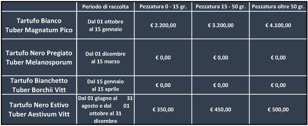 N.B. They are retail prices and represent an average of those reported by the traders of Acqualagna. Prices may vary within 24 hours.